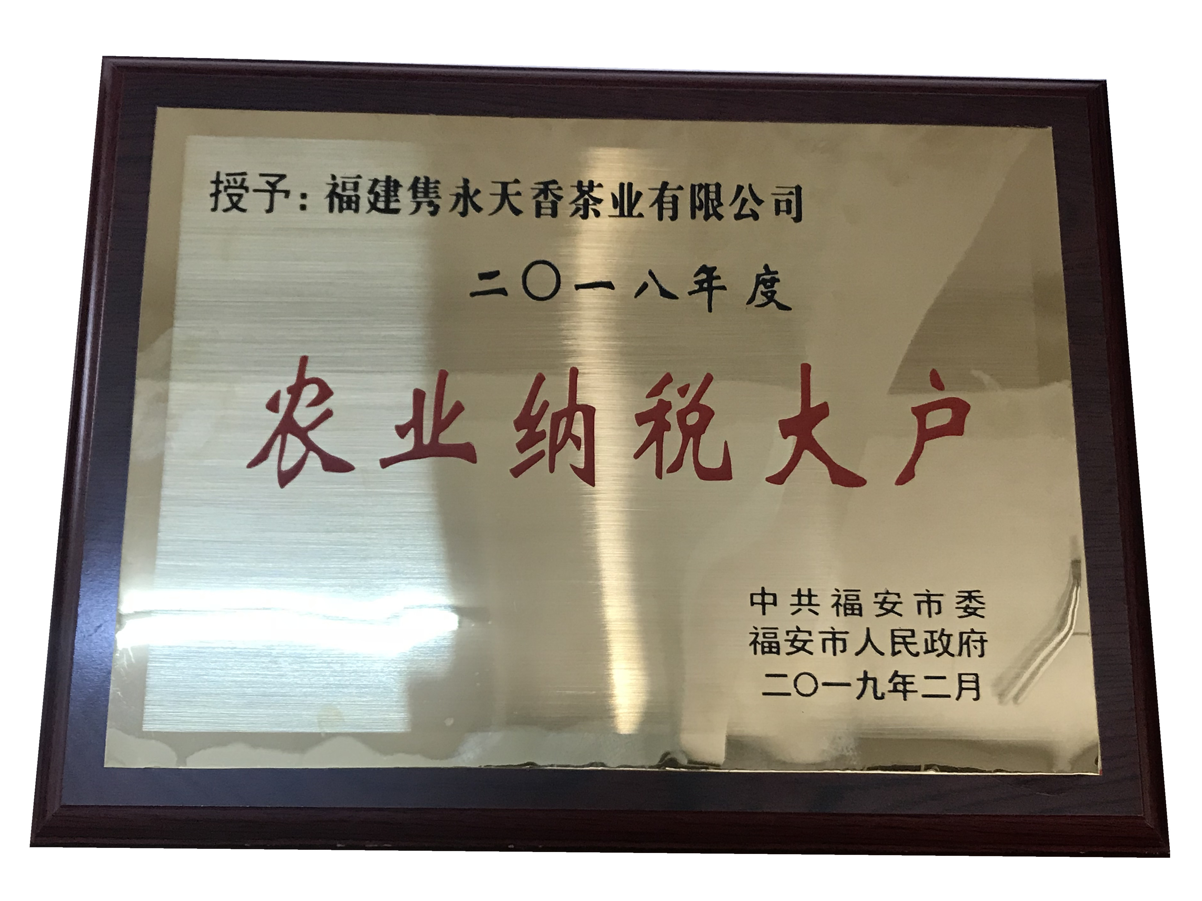 2019年2月12日,在2019年政府工作會議上,福建雋永天香茶業(yè)有限公司2018年度年產(chǎn)值1億5千萬元,納稅600多萬,榮獲2018年農(nóng)業(yè)納稅大戶。迄今為止,福建雋永天香茶業(yè)有限公司已經(jīng)連續(xù)16年福安農(nóng)業(yè)納稅大戶,9年納稅第一!